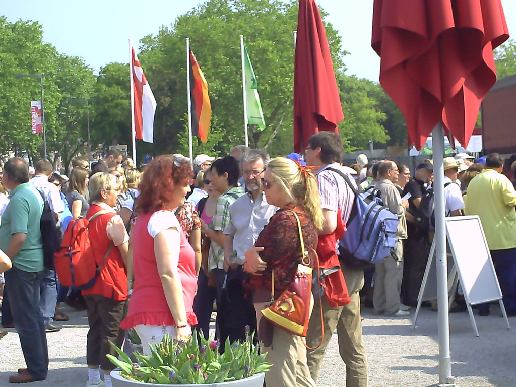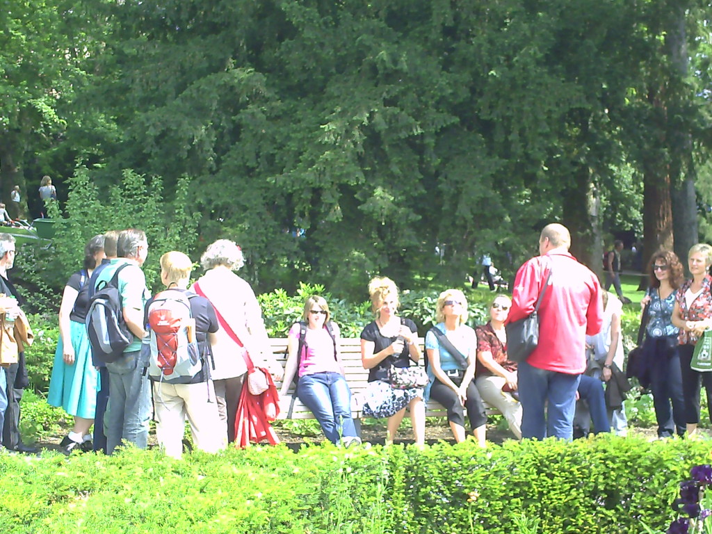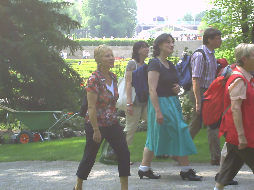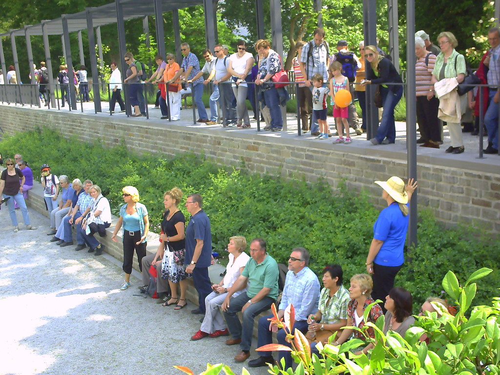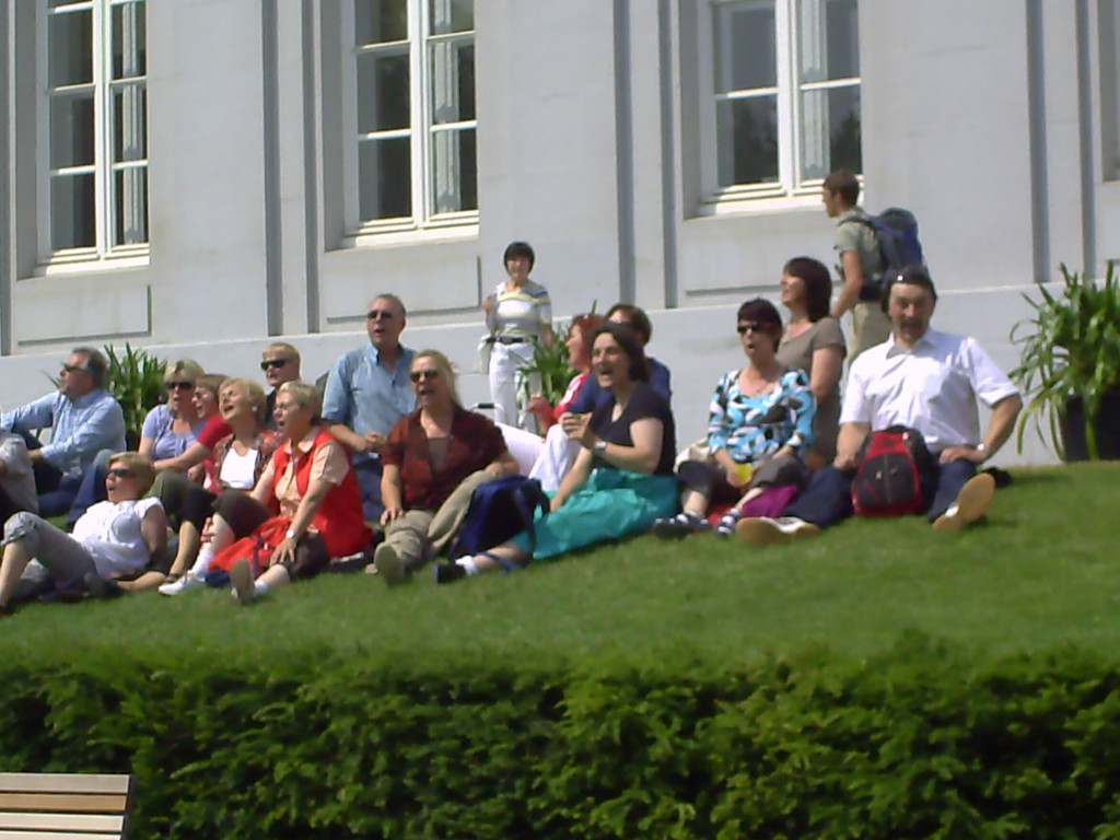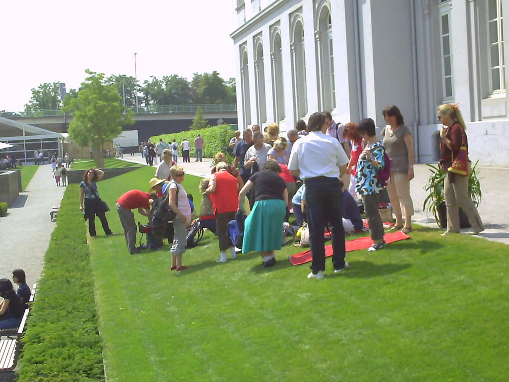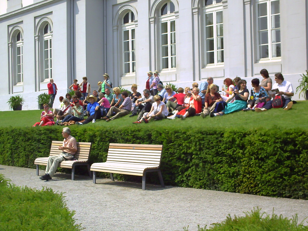 Der Undercoverchor kommt ohne Technik aus und ist doch sehr weittragend im Klang. Im oben gezeigten Bild hat sich der Chor zu einem Picknick niedergelassen. Im linken Bild spaziert er singend durch die Menschenmenge. Die Aufmerksamkeit und die Verwunderung der Gäste ist immer wieder deutlich zu merken.